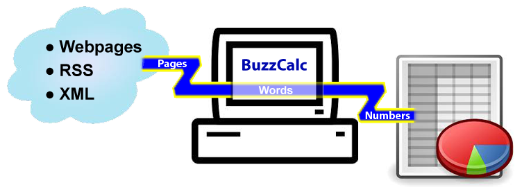 BuzzCalc runs separately from Excel. It is an engine that you control. You tell it what web sites to scan, when to fetch and what to store. BuzzCalc runs in the background analyzing word patterns. Your Excel formulas link to it and get results.