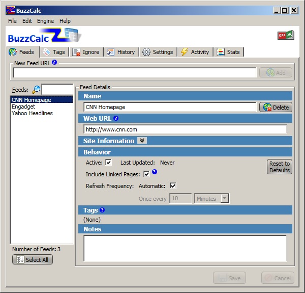How often should the feed be scanned? You can let BuzzCalc figure this out for you. By selecting 'Automatic', BuzzCalc constantly adjusts the refresh timing based on how frequently it sees new data. You may also set a constant frequency yourself.