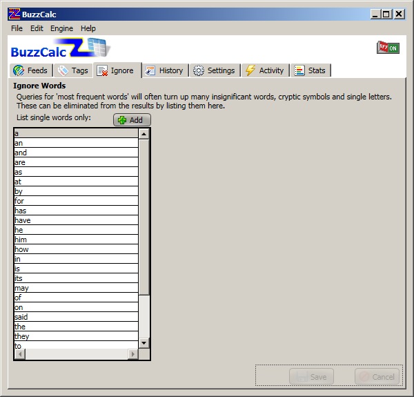 Queries for 'most frequent words' will often turn up many insignificant words, cryptic symbols and single letters. These can be eliminated from the results by adding them to the 'Ignore List'.